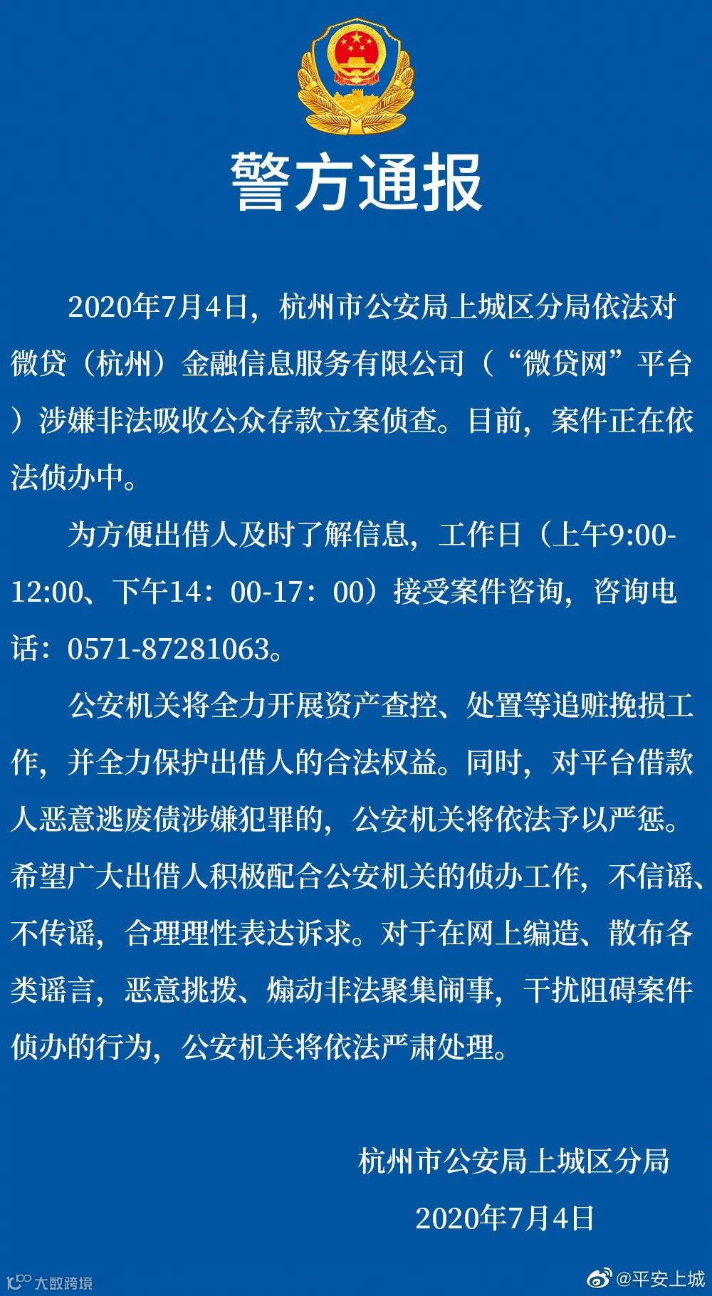7月4日深夜,杭州市公安局上城区分局公告警方通报,微贷(杭州)金融信息服务有限公司(“微贷网”平台)涉嫌非法吸收公众存款立案侦查。目前案件正在进一步的侦查过程中。