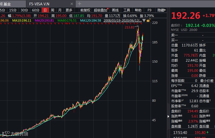 此外,上述QDII基金在2010年第三季度重仓持有的股票维萨,也是一只长线大牛股,从2010年6月至2020年6月这十年时间内,维萨的股票价格也上涨了9.8倍。