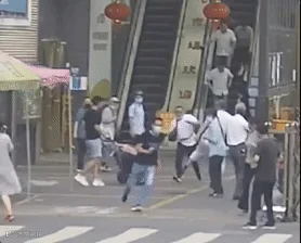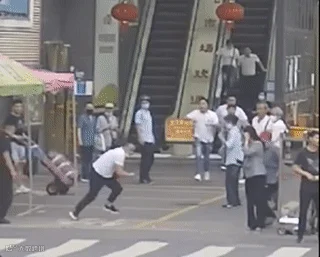 黑衣男子身材高大,动作敏捷,与两侧路人擦肩而过。白衣男子紧跟其后,就在离大门几米远时,一位大伯突然朝他伸出了左脚。白衣男子失去重心摔倒在地,随后民警和热心群众将其制伏。