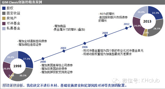 而在具体实践中,这个投资原则能够被长期坚持的重要原因,在于其投资策略中最重要的两个方面:资产配置与管理经理的选择。