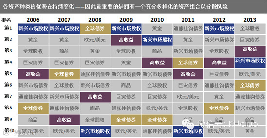 管理资产最难的一部分是,我们身处在一个很难预见未来的世界里。"如果你是个完美的预言家,你会知道某一年里哪个市场增长得最快。那么你可以在2006年和2007年的时候将所有的资产都投到新兴市场股权中去。2008年这个市场遭受了重创,而投资全球债券可获得12%的收益率。 2009年,全球债券则跌到了第9位。因此要坚信那个最古老的说法:多样化投资——不能把鸡蛋都放到一个篮子里。"Michael Simmeth如是说。