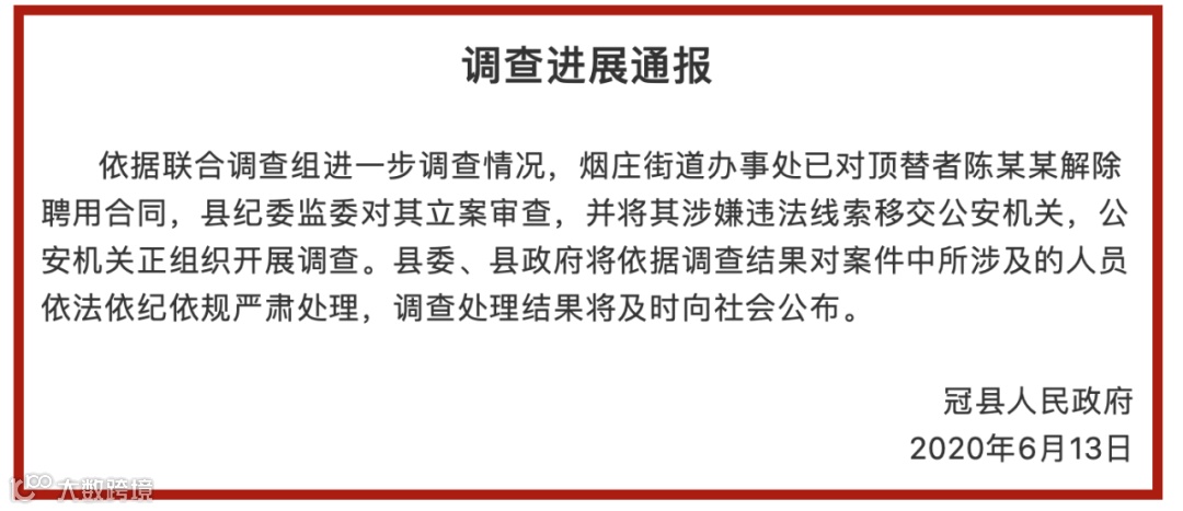 6月13日,山东冠县县政府发布调查进展通报,称陈某某工作所在地烟庄街道办事处已对其解除聘用合同。