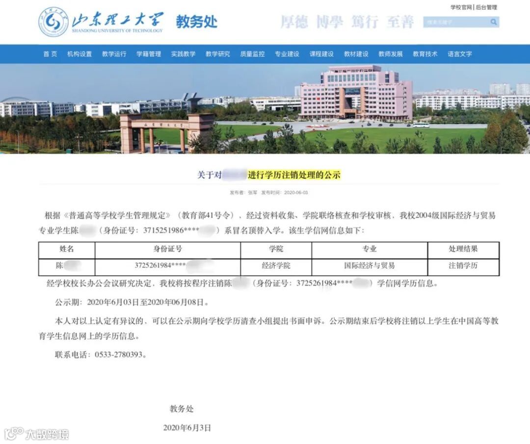 6月11日,山东冠县县政府在其官微通报称,顶替者为陈某某,系该县某街道办事处工作人员。目前已被停职,事件涉及详细信息正在进一步调查中。此前,山东理工大学已发布了注销冒名者学历的公示。