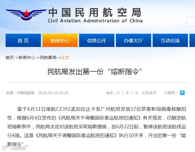鉴于6月11日南航CZ392孟加拉达卡至广州航班发现17位旅客新冠病毒核酸阳性,根据4日发布的《民航局关于调整国际客运航班的通知》有关规定,已触发航班熔断条件,民航局决定对该航班采取熔断措施,自6月22日起,暂停该航班该航线运行4周。这是《民航局关于调整国际客运航班的通知》执行10天来,开出的第一份“熔断指令”。