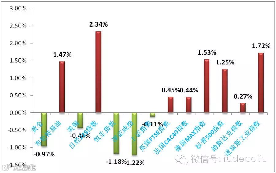 市场走势:美欧股市上涨,日本股市大涨,A股下跌,铜、黄金下跌,石油上涨。