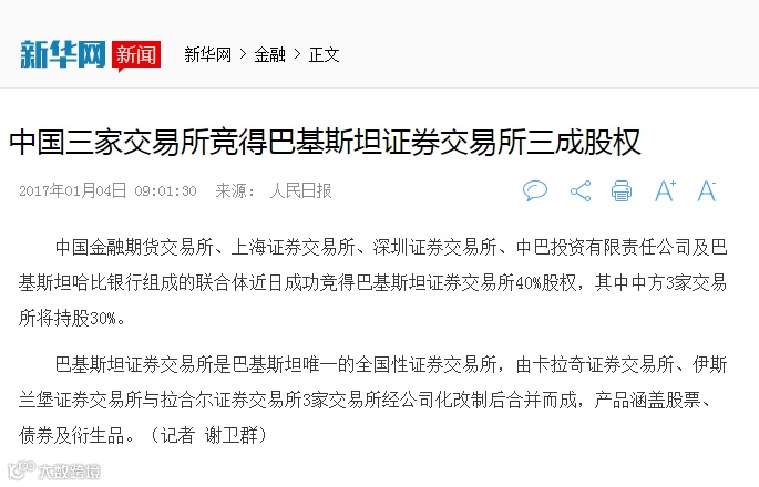 资料显示,2016年,中国金融期货交易所、上海证券交易所、深圳证券交易所、中巴投资有限责任公司及巴基斯坦哈比银行组成的联合体成功竞得巴基斯坦证券交易所40%股权,其中中方三家交易所将持股30%。