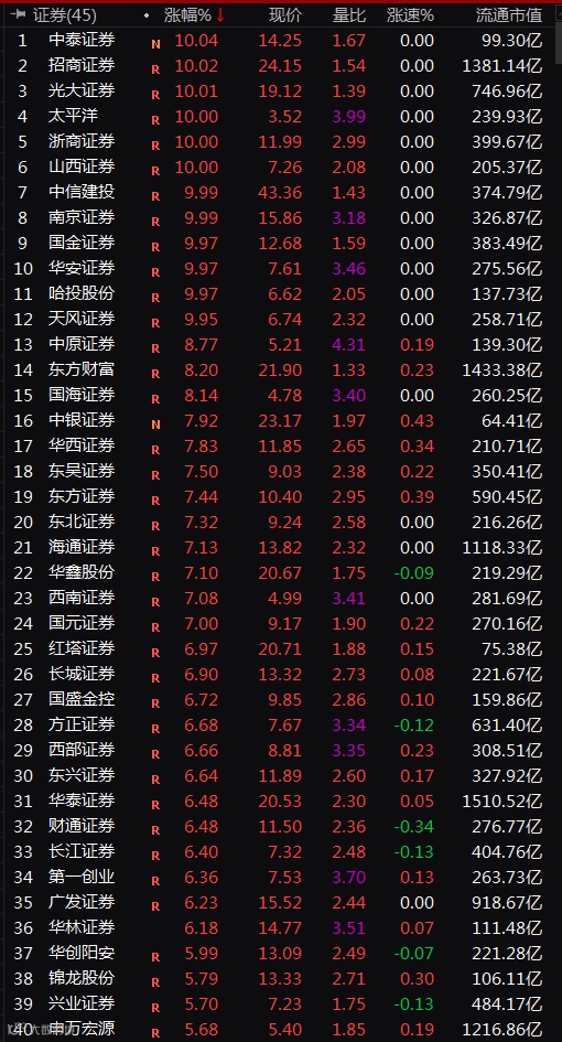 今日,券商股更是迎来大爆发,板块掀起涨停潮。截至收盘,券商信托板块大涨7.41%,其中,中泰证券、招商证券、光大证券、山西证券、浙商证券、太平洋、中信建投、南京证券、国金证券、华安证券、哈投股份、天风证券等12只券商股涨停,国海、中原证券大涨超8%。