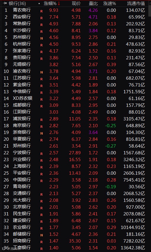 银行股大涨3.22%,更是带动指数上行。其中,青农商行涨停,西安银行大涨7.74%,常熟银行、长沙银行、苏州银行、张家港行等城商行涨幅均超过4%。