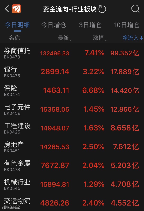 数据显示,今日券商信托板块资金的净流入达到99.35亿元,接近百亿元,成为市场最为吸金的板块;银行板块则收获了17.89亿元的净流入,排名第二;保险板块资金净流入为14.42亿元,排名第三。