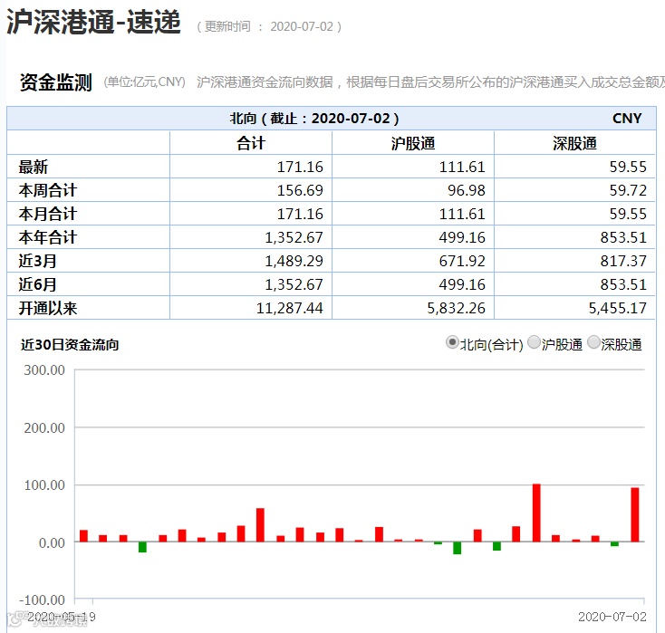 截至7月2日收盘,北向资金净买入171.15亿元,创6月19日以来新高;其中沪股通净流入111.61亿元,深股通净流入59.55亿元。值得注意的是,超过170亿元的净买入也进入沪深港股开通以来前五的位置。