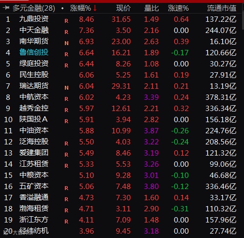 此外,多元金融板块的涨幅也达到4.51%,其中九鼎投资、南华期货、民生控股、瑞达期货、越秀金控等股票涨幅均超过5%。