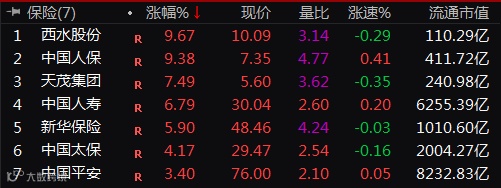 其中,保险板块今日大涨6.68%,中国人保一度涨停,收盘大涨9.38%,中国人寿大涨6.79%,新华保险大涨5.90%,中国平安上涨3.40%。