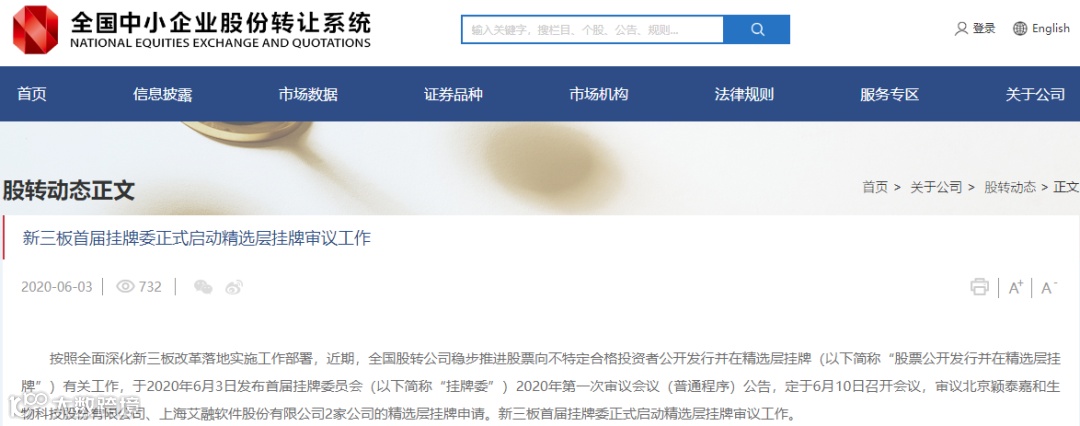 3日晚间,全国股转系统发布公告称,新三板首届挂牌委员会将于6月10日召开会议,审议北京颖泰嘉和生物科技股份有限公司、上海艾融软件股份有限公司2家公司的精选层挂牌申请。新三板首届挂牌委正式启动精选层挂牌审议工作。