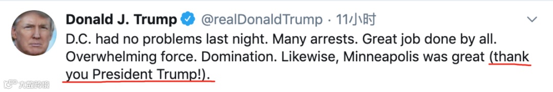 据长安街知事,就在局势持续紧张之际,特朗普不忘发推自夸:“华盛顿特区昨晚没出什么状况。许多人被抓了。所有各方都干得漂亮。压倒性的力量。控制住了。同样,明尼阿波利斯也做得很棒(感谢你,特朗普总统!)”