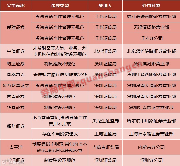 券商中国注意到,名不见经传的爱建证券,自去年9月以来,其分支机构已收到了8份监管罚单。而据券商中国记者不完全统计,今年年初至今,已共有10家券商分支机构收到了来自监管的13张罚单,包括10张营业部罚单,3张分公司罚单。