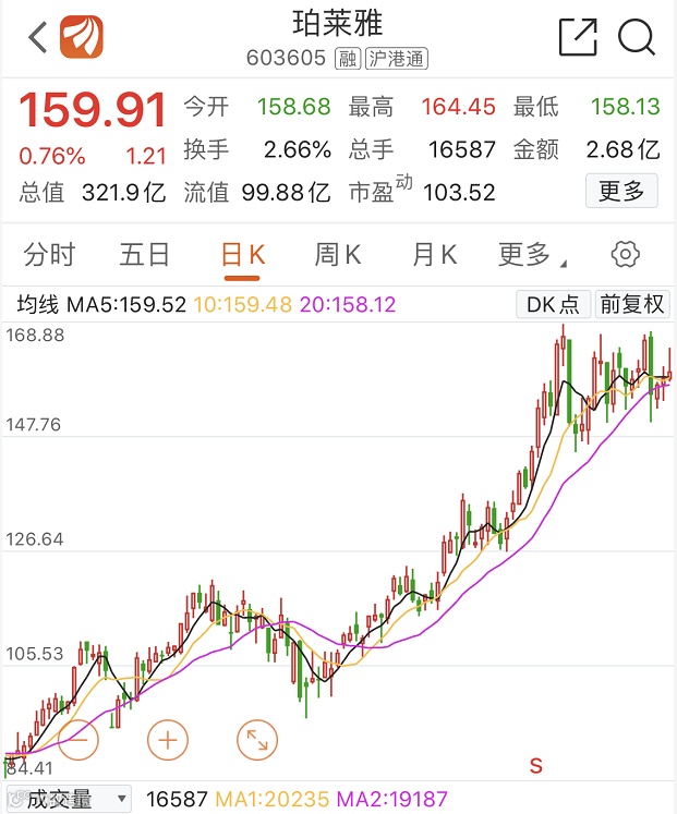 自去年底全球著名的化妆品上市公司欧莱雅的股票超过了1万亿人民币的市值,珀莱雅公司就成为这种对标的受益者,尽管珀莱雅想成为一家全球性公司似乎遥不可及,甚至在国内市场的中高端市场还要面临强大的外资品牌竞争,但主力资金还是给予很高的期望,甚至在珀莱雅的机构投资者调研中,披露的信息显示有非常多的外资QFII关注这家上市公司,从今年年初开始,珀莱雅的股价在对标海外公司的背景下,呈现加速上涨的态势。