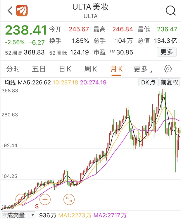美股上市公司Ulta美妆是北美最大的化妆品连锁代运营商,这与丽人丽妆、御家汇的区别在于,前者是线下,后两者则是线上。但是,Ulta美妆这家需要在线下各大城市不断开分店的公司,却成为该领域的龙头,提供多达25000种化妆品,股价也因此在十年时间最高上涨接近100倍,截止目前,虽然化妆品网络运营已经侵蚀传统线下销售,但该公司当前市值还是超过了1000亿人民币。