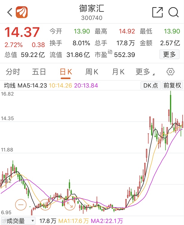 主力资金在对丽人丽妆的IPO过会预期下,很快关注到与丽人丽妆代销模式相仿的另一家上市公司。这就是A股的御家汇。这家化妆品上市公司原本主打自己的品牌,但如今的御家汇似乎已经注意到卖别家的化妆品,也是一样的赚钱。