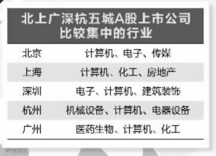 从五城上市公司所属行业来看,也各具特色,北京和上海计算机行业公司占比最高,以北京为例,计算机一个行业公司数量就占当地A股公司总数约两成;深圳的优势产业是电子产业,该市电子行业A股公司占比最高;杭州和广州各自的产业优势也投射到了资本市场,两市A股公司中占比最高的行业则分别为机械设备和医药生物行业。