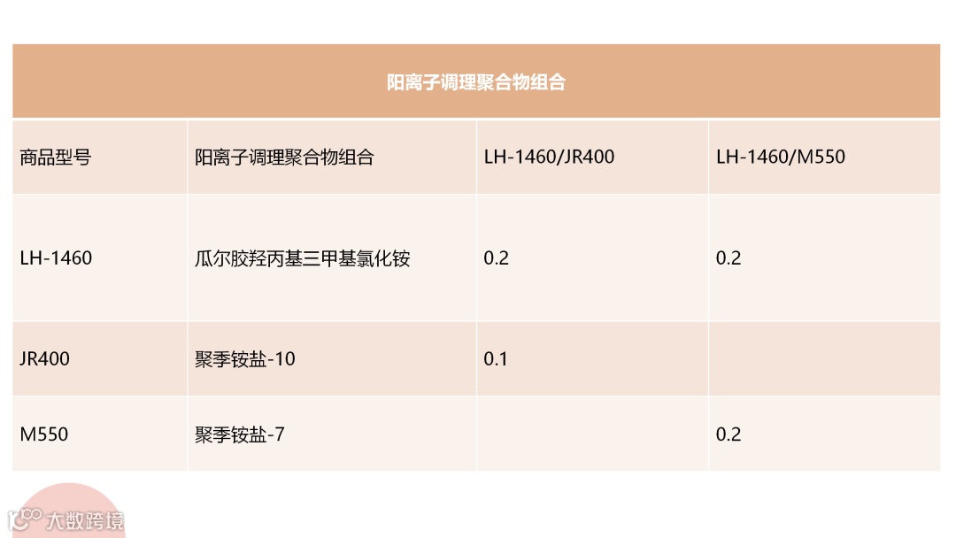 将LH-1460瓜尔胶羟丙基三甲基氯化铵与JR400聚季铵盐-10的组合作为对照组合(以下简称LH-1460/JR400),将LH-1460瓜尔胶羟丙基三甲基氯化铵与M550聚季铵盐-7的组合(以下简称LH-1460/M550)。阳离子调理聚合物组合的添加量信息如下表所示。
