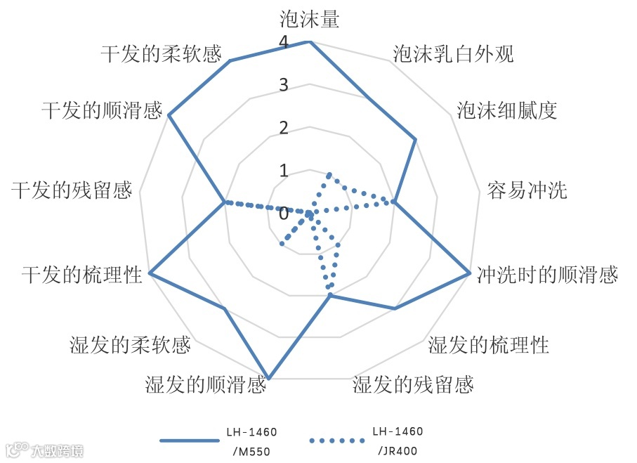 由此可见,相对于对照组合,LH-1460/M550组合显示出了较低的硅油沉积性,多次洗发也不会造成严重的硅油积聚,不会加重头发的油腻以及残留感等,提供了洗发水清爽调理技术的解决途径。