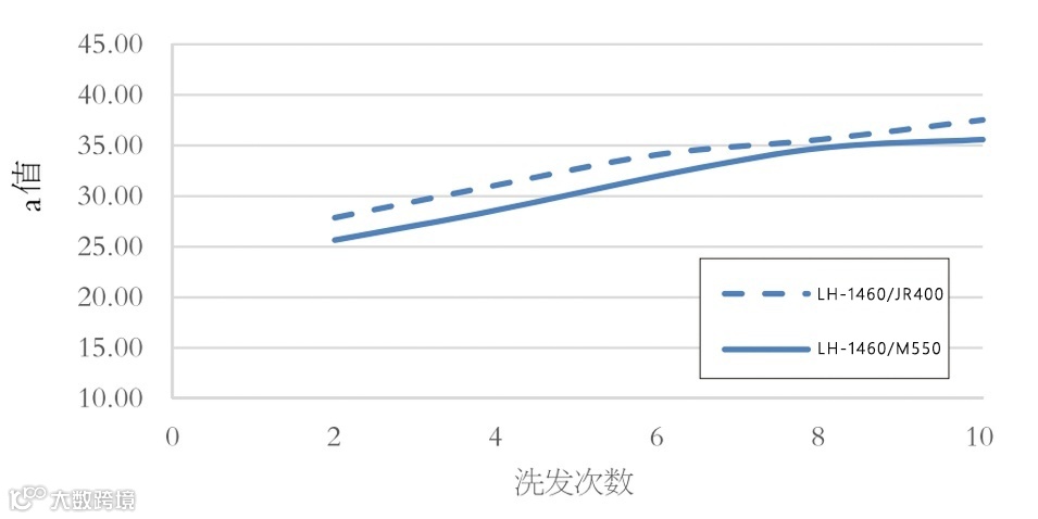LH-1460/M550组合在洗发一次时,显示最低的吸附值,a值低于14,阳离子聚合物的沉积随着洗发次数的增加而增加,但其沉积值始终低于对照组合。在洗发10次后,沉积值已经接近稳态,a值约为35.6。