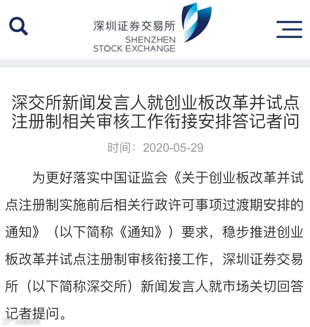 为更好落实证监会《关于创业板改革并试点注册制实施前后相关行政许可事项过渡期安排的通知》(以下简称《通知》)要求,稳步推进创业板改革并试点注册制审核衔接工作,深交所新闻发言人5月29日就市场关切回答记者提问,主要从不同审核环节衔接安排、行业负面清单适用性、财报有效期、举报核查等方面进行了一一解答。