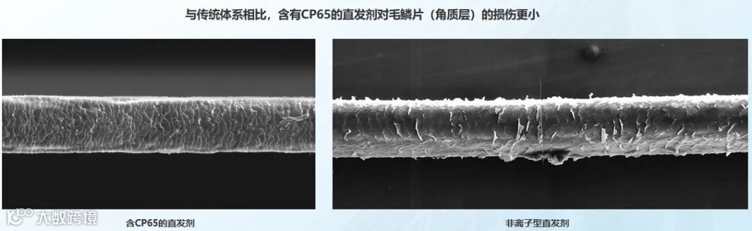 对两根发丝进行的扫描电子显微镜(Scanning Electron Microscopy,SEM)观测显示,其中一根发丝使用含CP65的直发剂处理,另一根则使用非离子型直发剂处理,结果清晰表明,使用CP65直发剂时,发丝受损程度显著降低。这些卓越效果得益于CP65能够使油脂沉积,同时立即释放携带活性成分(即氢氧化钠NaOH)的水分。