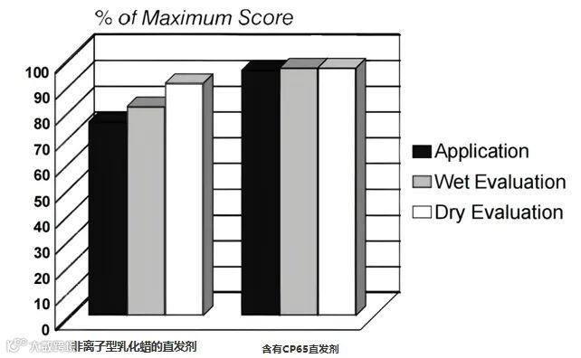半头(将头发分为两部分分别处理)沙龙试验证实,使用含CP65的直发剂能显著改善直发后的发丝外观与触感。在一项独立评估中,研究人员将含CP65的氢氧化钠直发剂与含非离子型乳化蜡的直发剂的效果进行了对比,结果如条形图所示。