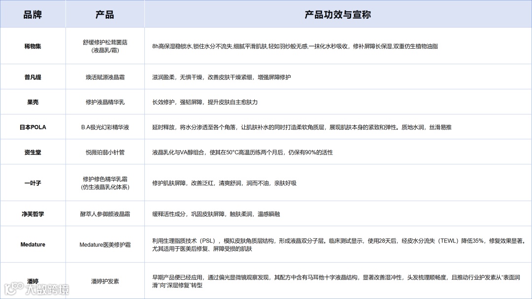 比如稀物集靠液晶的层状结构,让乳液更稳定;普凡缇利用它的缓释效果,让活性成分更好地渗透进皮肤;日本 POLA 则通过仿生液晶膜技术,把肤感和保湿力都做得更出色。这也能看出,这项技术不仅能切实解决行业常见难题,更能助力品牌完成产品 “场景 + 情绪 + 信任” 的三位一体价值重构,成为品牌在红海市场中突围、撬动新增长的关键支点。