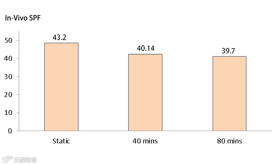 研究发现,CP65能实现更显著的油脂沉积效果,且具备更强的抗冲洗能力,从而使得防晒制剂的静态防晒指数(SPF)更高(在0分钟时测定),并能维持更持久的水中防晒效果(在80分钟时测定)。防晒产品所展现出的更高SPF值,被认为得益于CP65增强了油脂沉积效果并提高了持久性。从图表中的SPF可明显看出,CP65提升了防晒产品的性能。