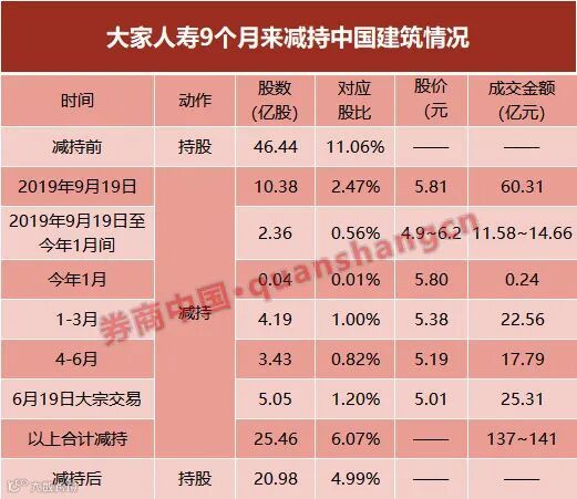 根据上交所网站披露,当日大家人寿合计出售5.05亿股中国建筑的大宗交易一共有9笔,每笔交易的股数在1500万股到2.79亿股之间,成交价都为5.01元/股,合计成交金额25.3亿元。