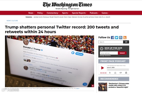 “特朗普打破个人纪录,24小时内原创及转推200条”,《华盛顿时报》6日以此为题的报道说,特朗普5日打破纪录时,美国正处于新冠肺炎疫情危机与黑人男子弗洛伊德之死引发的抗议活动交织之际。报道还说,关于特朗普破纪录的数据来自于专门追踪特朗普每日推文的网站“Factba.se”。