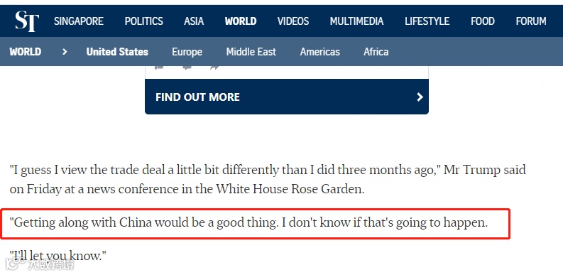 据海峡时报,当地时间周五,美国总统特朗普在白宫玫瑰园举行的新闻发布会上说:“我认为与三个月前相比,我对这项贸易协定的看法略有不同。”“与中国相处将是一件好事。我不知道这是否会发生。”“我会告诉你。”