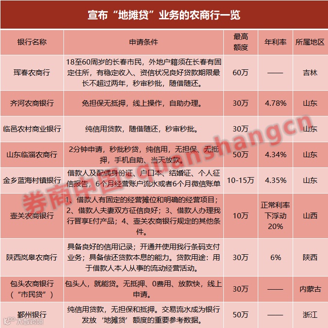 此后,山东临淄农商行、金乡蓝海村镇银行、临邑农村商业银行、壶关农商银行、齐河农商银行、陕西岚皋农商行和鄞州银行陆续推出。6月5日,包头农商银行就“摆摊”业务推出相应产品“市民贷”,虽名称不一样,但业务大同小异。当天,鄞州银行接力,也推出了一款名为“地摊贷”的信用贷款,成为宁波第一家推出“地摊贷”的银行。