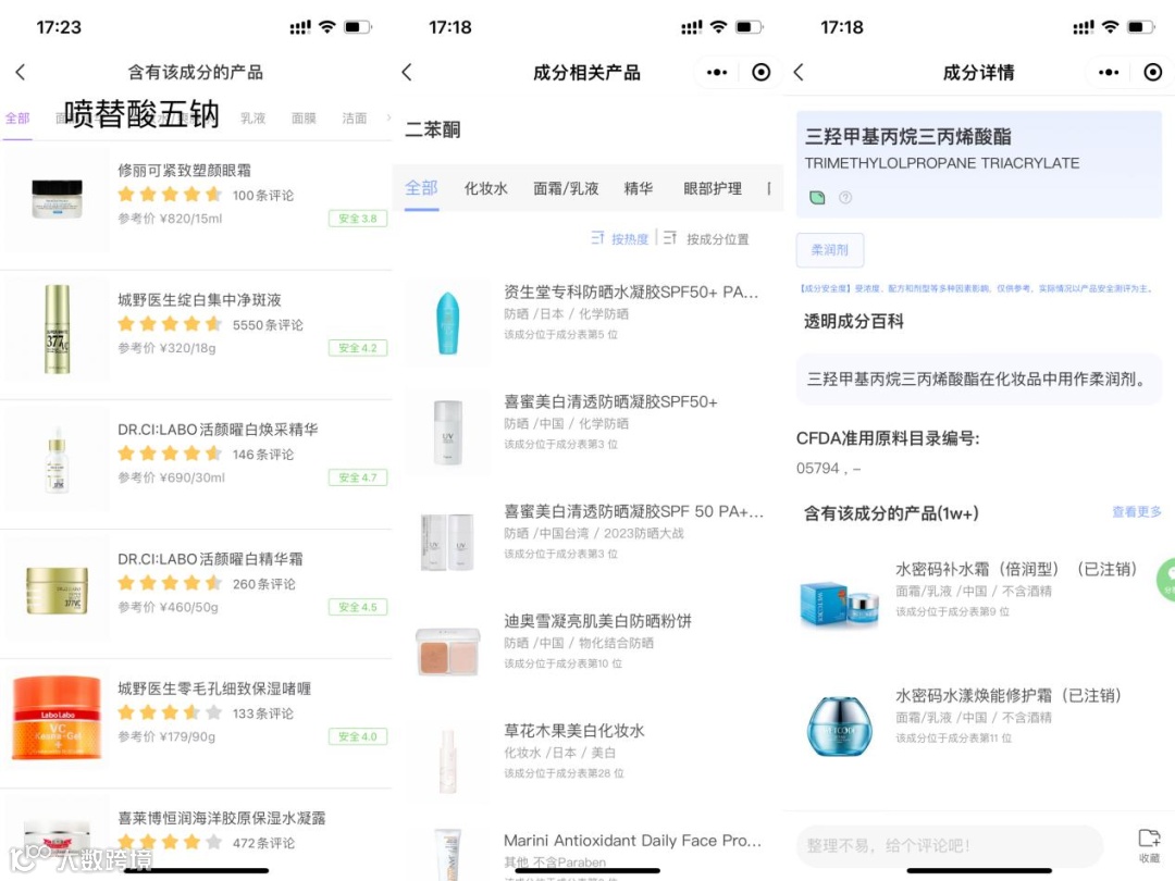 美妆头条查询了美丽修行APP及透明成分标签小程序后发现,在这近两万个产品中也不乏知名品牌产品添加了被禁原料。例如,资生堂专科防晒水凝胶等产品均添加了二苯酮;修丽可紧致塑颜眼霜、城野医生绽白集中净斑液等含有喷替酸五钠等。