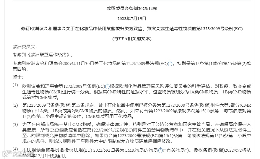 7月19日,欧盟委员会发布(EU) 2023/1490,修订化妆品法规(EC) No 1223/2009 中的“化妆品禁用物质清单”(附录 II),新增被认定为致癌、致突变或生殖毒性 (CMR) 的物质。