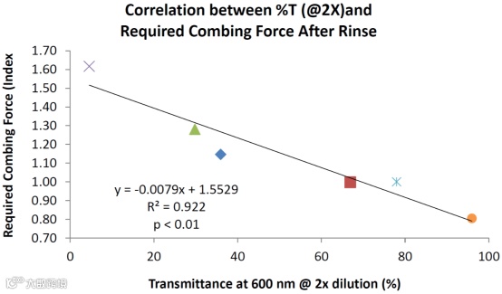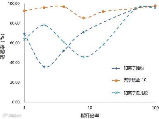 比较了三种阳离子高分子——常用的聚季铵盐-10和阳离子瓜尔胶以及比较新的阳离子淀粉。结果发现:传统的聚季铵盐-10和阳离子瓜尔胶相比,阳离子瓜尔胶形成絮胶的量是比较多。阳离子瓜尔胶和阳离子淀粉相比,形成絮胶的量差不多;但比较有趣的是,两者形成絮胶的时间点不一样。横轴是洗发水的稀释倍数,纵轴是透过率,实验结果发现,阳离子淀粉在稀释倍数比较低时会出现大量絮胶,阳离子瓜尔胶却是在稀释倍数相对较高的情况下才出现絮胶。