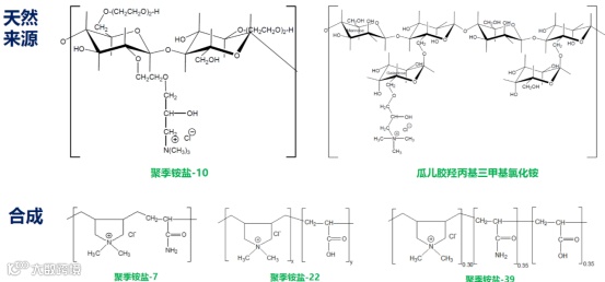 阳离子高分子方面,洗发水里面常用的阳离子高分子是聚季铵盐-10 和阳离子瓜尔胶。根据需要也会复配一些合成的、小分子的、高电荷密度的聚季铵盐-7、22、30、78来复配。