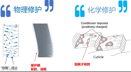 护发技术的开发主要从两方面入手,一方面是物理修复。给头发表面附着一些修护成分或保护膜,里面包括絮胶和油脂。另一方面是化学修护。因为头发受损后会变成亲水,呈负电荷状态,所以能通过阴阳离子吸附作用来实现头发的修复。