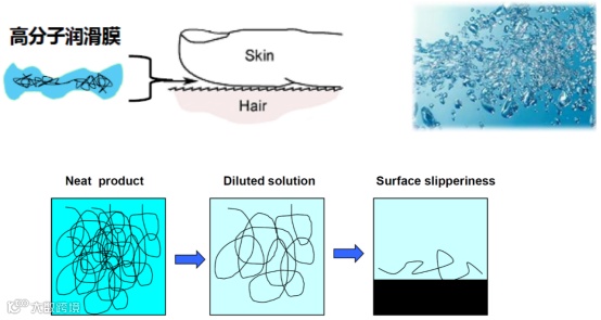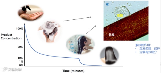 在湿发护理方面,洗发水中主要是絮胶技术。在洗头时,相当于用水不断地稀释洗发水。在冲洗头发的稀释过程中,会形成右上角电镜图里面一个含水的凝胶状络合物,即絮胶。其作用主要是保持湿发的柔顺以及协助运载有效成分。