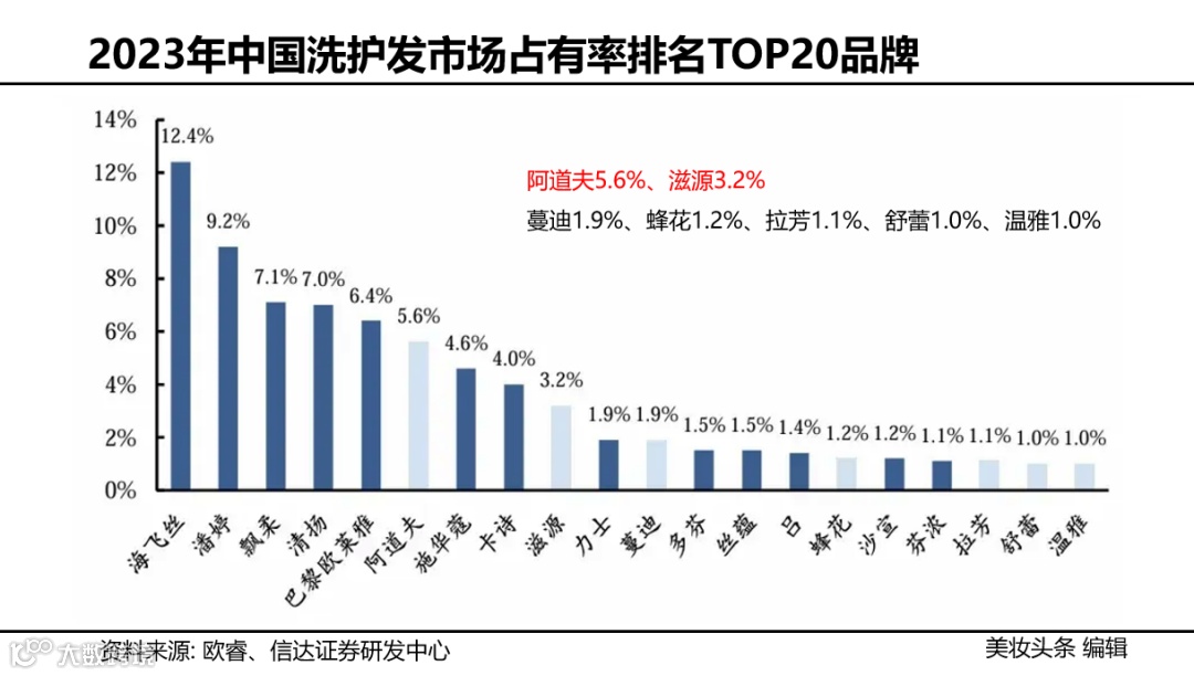 根据信达证券数据,国产品牌排名第一的阿道夫,近年来增长遭遇滑铁卢,在2020年快速增长之后,2021-2023年市占率已连续三年下滑;滋源,最近4年则遭遇增长颈期。从前十名来看,国货似乎“没有一个能打的”。