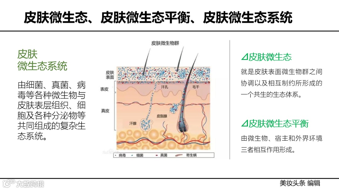 公开科普资料显示,皮肤微生态,就是皮肤表面微生物群之间协调以及相互制约所形成的一个共生的生态体系,在头皮表面形成屏障;皮肤微生态系统,由细菌、真菌、病毒等各种微生物与皮肤表层组织、细胞及各种分泌物等共同组成的复杂生态系统;皮肤微生态平衡,由微生物、宿主和外界环境三者相互作用形成。
