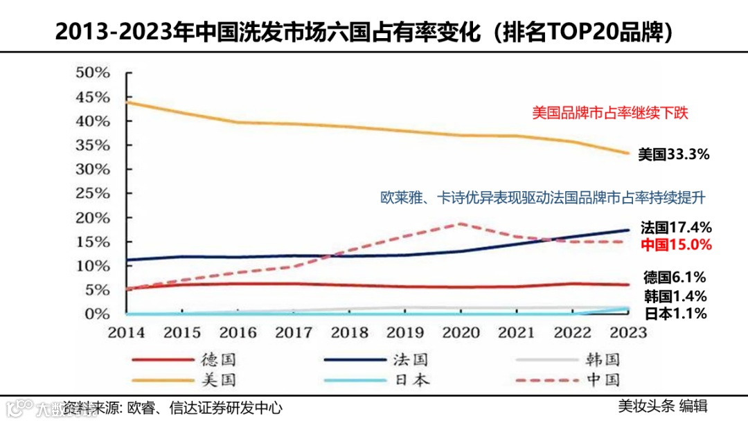 2013-2023年中国洗发市场六国占有率变化(排名TOP20品牌)显示,巴黎欧莱雅、卡诗市占率持续提升,驱动法国品牌市占率稳定增长。因此,定位高端头皮功效洗护的“卡诗”品牌,应该是国货品牌头皮护理赛道最强劲的对手。同时,也是一个值得大家学习与借鉴的标杆品牌。