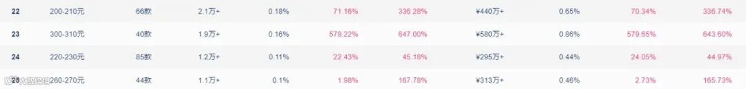 在价格分布方面,婴童洗护产品的主流价格区间为10-40元,其中10-20元价格带位列第一,商品sku数达4864款。同时,一些中高端的价格带如200-210元、220-230元、260-270元、300-310元等呈现出量额齐升的现象,婴童洗护赛道高端化趋势初显。