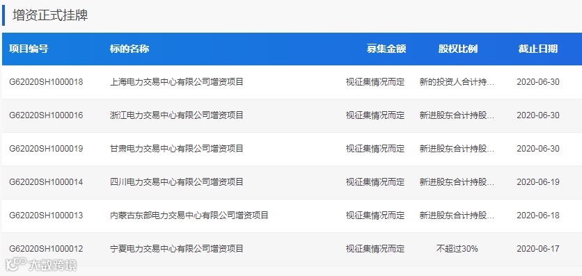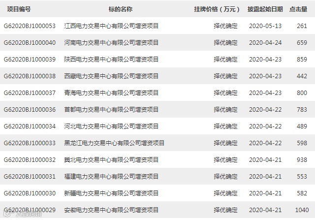 果然,今年4月开始,国家电网旗下其余18家电力交易中心的增资项目也陆续在北京产权交易所、上海联合产权交易所挂牌。