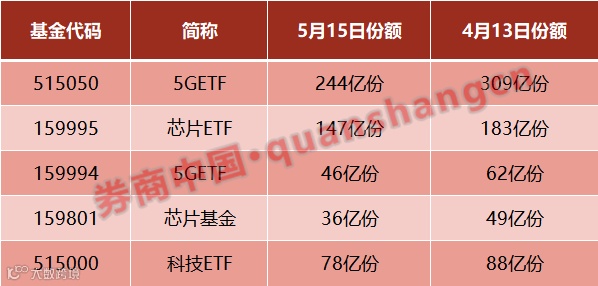 Wind统计显示,以4月13日基金份额与5月15日基金份额对比发现,其中5GETF份额减少65亿份,降幅最多,该基金在4月中旬时份额一度突破300亿份,为规模最大的科技类ETF基金,由于资金不断流出,该ETF份额缩水超过20%。芯片ETF基金也被资金看淡,在所有科技类ETF基金中份额下降排名第二,一个月内减少份额达到46亿份,份额较高位缩水20%。