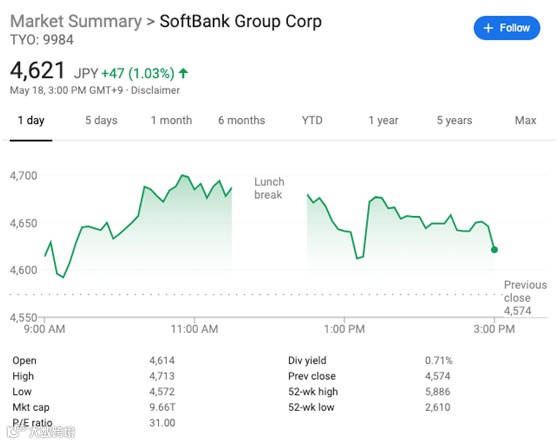 此后软银股价开始回升,一月内上涨了70%。截至5月18日收盘,软银在东京交易所的收盘价为4621日元,涨幅1.03%,市值为9.57万亿日元,约合893亿美元。