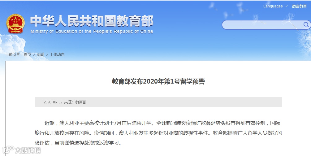 9日,教育部发布2020年第1号留学预警,全文如下: