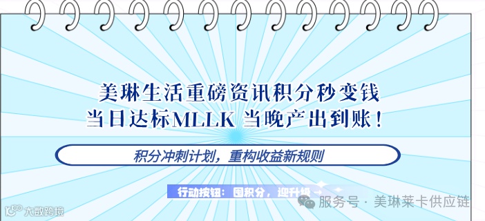 为激活生态活力,提升收益感知,美琳生活即日推出全新「积分冲刺・即时收益」活动!当日新增MF积分达标指定档位,当晚自动产出MLLK,燃烧积分后净收益即时到账,新老用户均可通过低门槛参与,轻松实现“积分变现+价值升值”双收益!